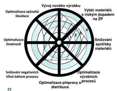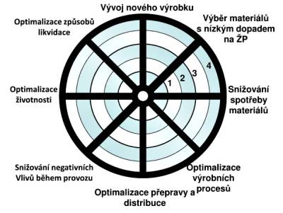 Strategické kroky ekodesignového návrhu vyjadřuje ekodesignové kolo s osmi segmenty (loukotěmi) :