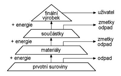 Rudy, nerostné suroviny, ropa a podobně jsou základem pro výrobu materiálu - kovů a plastů. Z materiálů jsou vyráběny jednotlivé součástky a z nich kompletovány finální výrobky. Po přechodu na vyšší stupeň dochází ke zvýšení hodnoty výrobku, spotřebuje se energie a současně dochází k produkci odpadu, obvykle bez dalšího využití ve výrobním závodě.